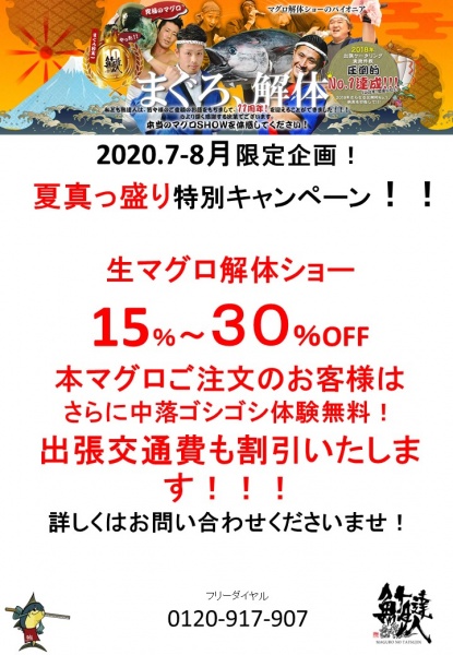 鮪達人です!大阪・和歌山のみならず、全国各地色々な場所にマグロ解体ショーの出張ケータリングを行っています!最近は東京も増えて参りました!私達、鮪達人は東へ西へ北へ南へ何処までも向かいますが、マグロちゃんはもっと凄いです!泳ぐのを止めない...