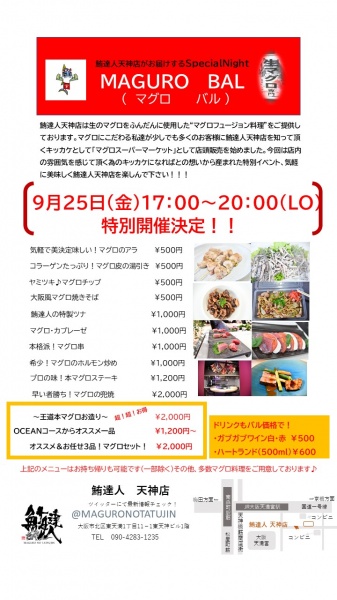 鮪達人です!普段はマグロ解体ショーの出張ケータリングで東京は勿論、全国各地にマグロ解体ショーに赴いておりますが、東天満に”鮪達人天神店”という飲食店も運営しております。9月11日に第一弾として開催したマグロバル、大盛況でので第2弾が明日9月25日... -