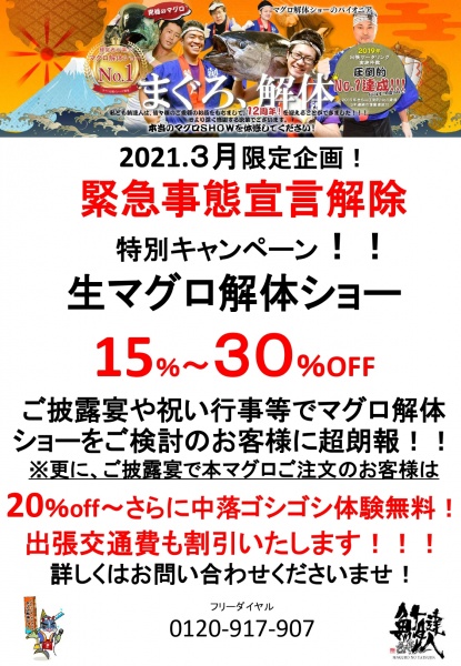 鮪達人です。2021.3月のお得なキャンペーン情報!2021年も3月を迎えました!春も間近になりましたね!関西も緊急事態宣言解除され、新たな気持ちで3月を迎える事ができましたね!安心安全に、イベントの計画をスタートさせるお客様もいらっしゃると思い... -