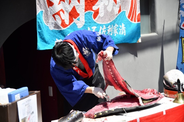 いよいよマグロを担ぎマグロードを回遊する時間。マイクパフォーマンスと鐘の音が響く中、お客様の真横をマグロが堂々のご登場です。