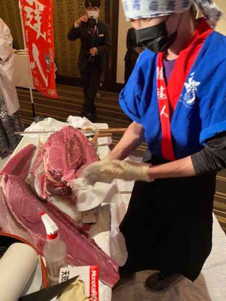 ステージに到着すると改めて生マグロちゃんと一緒に記念撮影、幸せを呼びこむと言われるマグロちゃんと一緒に写真を撮る事で、ゲストの皆様にも幸せが訪れる。。そんな素敵な記念撮影が終わると次はケーキ入刀式ならぬ『マグロ入刀式』を行います!マグロ入刀式というのは見た事もない方が多く、又ケーキで異なりまして一年中泳いでいるマグロちゃんは皮が大変固いです。マグロ長刀をケーキナイフに見立ててゴシゴシと頭の部分を何往復もします!その時にゲストの皆様が『よいしょ~よいしょ~』の大合唱で盛大かつインパクト満載です!!!いかがでしょうか?鮪達人のエンターテインメント解体ショー♪記憶にも記録にも残るひと時を我々が演出致します。
