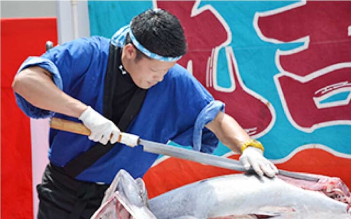 生マグロは市場にたった1割しか流通していない貴重なマグロです。マグロ解体ショーの迫力だけでなく、その後のお振舞い寿司も絶品です。”幸せを呼ぶ魚”と言われるマグロですので、お祝いイベントには最適です!鮪達人の演出として【マグロ入刀式】があります。折角ですので一太刀目はお客様に行ってもらいます!この『マグロ入刀式』で参加されるお客様全てに多くの幸せを届けます!