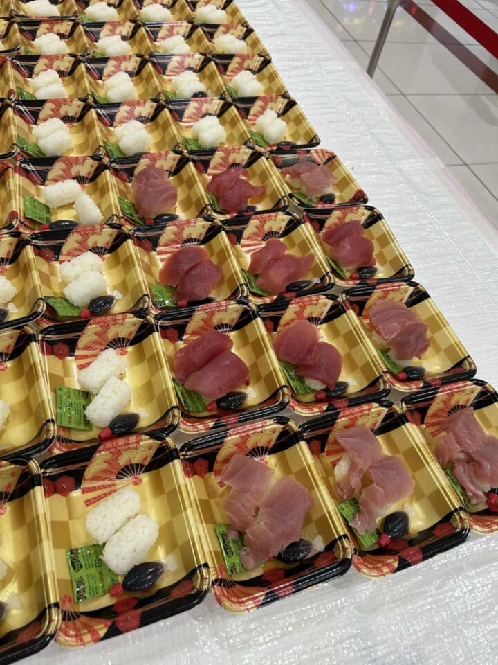 マグロの5枚おろしが終えますと、捌きたての新鮮生マグロをお寿司にして皆様へお振る舞いです。